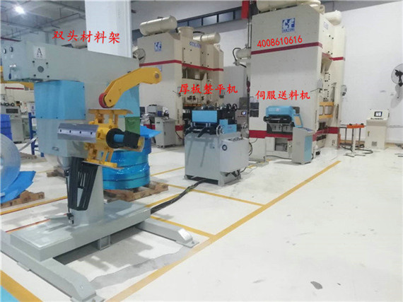 B、雙頭開(kāi)卷機(jī)+伺服送料機(jī),實(shí)現(xiàn)卷料的高精度開(kāi)卷送料沖壓工作,雙頭開(kāi)卷機(jī)可以做到同時(shí)裝載兩卷材料,節(jié)省停機(jī)送料時(shí)間;伺服送料機(jī)可以實(shí)現(xiàn)高精度、高速度的送料,通過(guò)人機(jī)界面,可以簡(jiǎn)單方便地設(shè)置送料步距等參數(shù),啟動(dòng)和停止輔助功能,隨時(shí)讀取相關(guān)生產(chǎn)參數(shù)。